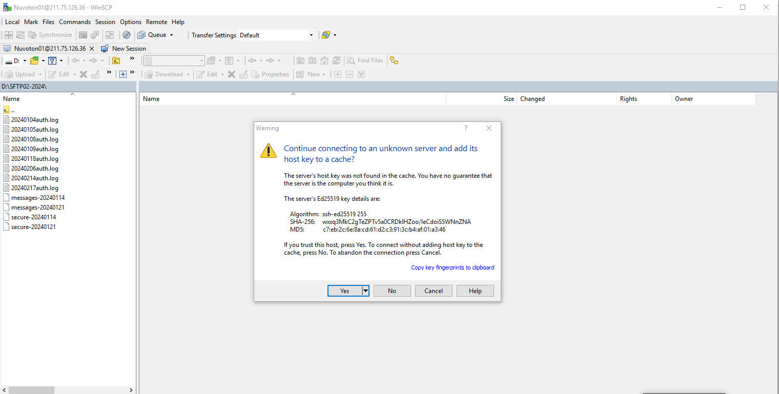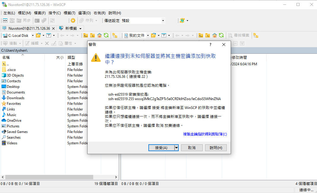 5. 第一次連線時,連接到未知伺服器並將其主機密鑰添加到快取中,選擇接受。若出現潛在的安全漏洞,請更新 |