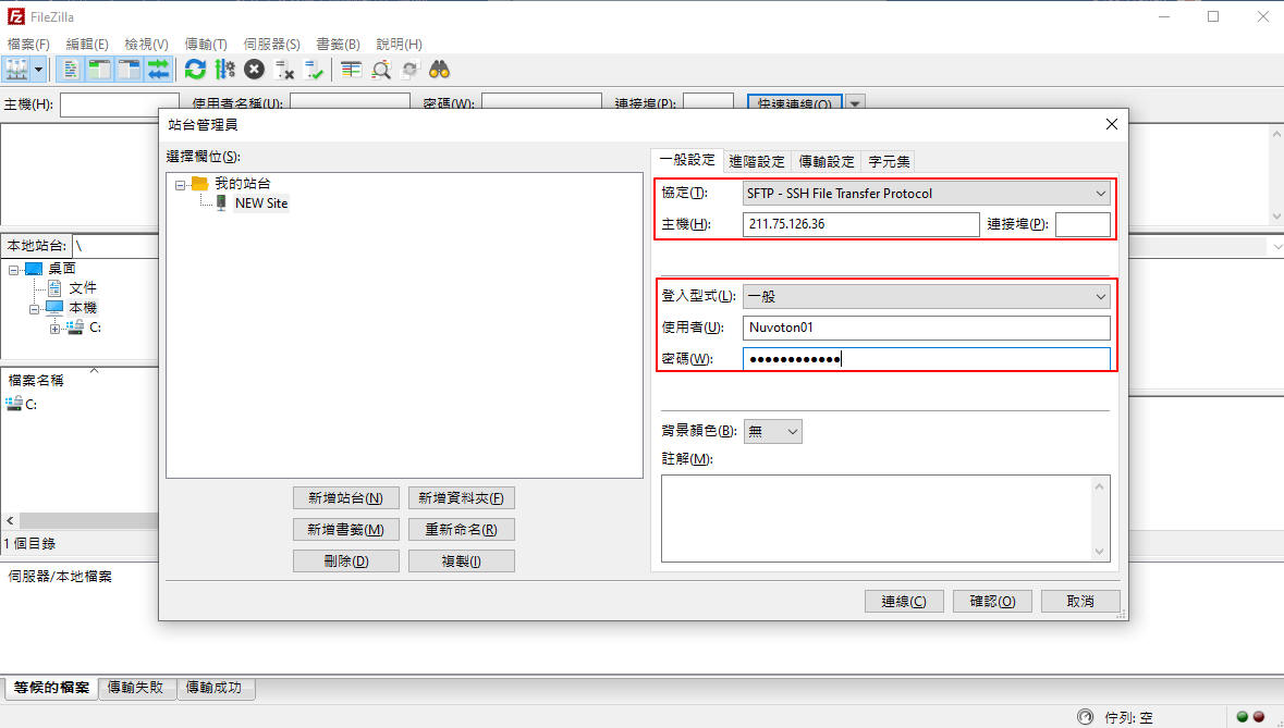 3. 點選「新增站台」輸入站台名稱後在右方「一般設定」處請將相關資訊輸入紅色框框內:主機:211.75.126.37(IEF) 伺服器種類: SFTP –SSH File Transfer Protocol登入型式:選「一般」 使用者、密碼請自行輸入。 |