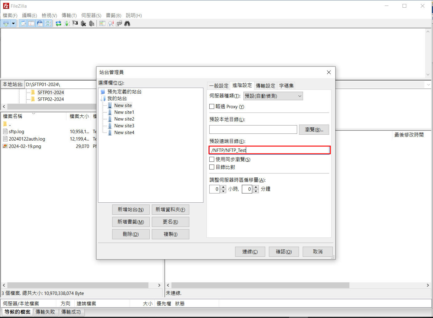 4.在「進階設定」處於「預設遠端目錄」內輸入指定路徑;然後按「連線」進行SFTP傳輸。