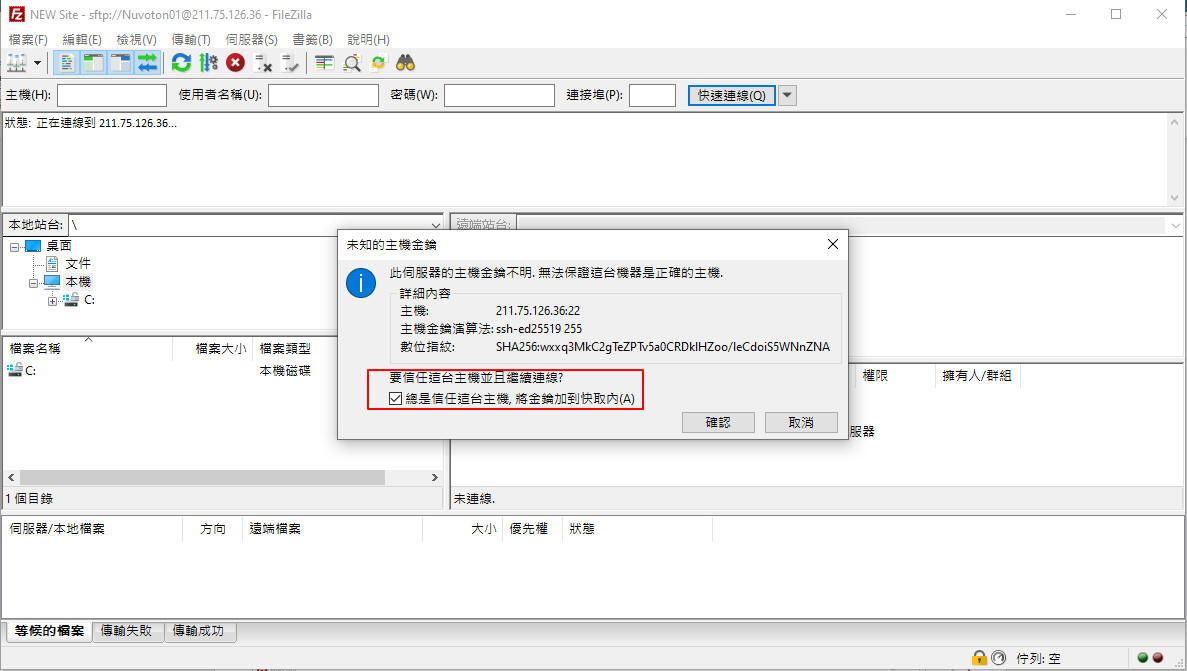 5.第一次連線時,由於憑證是自建的,沒有信任關係,所以才會出現「未知的主機金鑰」警告畫面,你可以勾選「總是信任這台主機,將金鑰加到快取內」即可跳過這個警告。