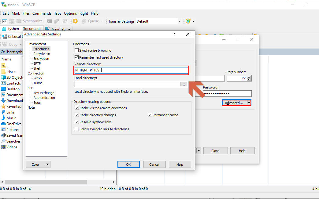 4.Click“Advance” and “default remote directory”: To set specify the pathand click Login (If the directory does not set, login to default directory) |