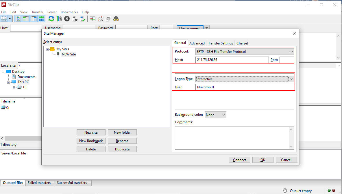 3.Click “New site site“ , modify General page information: Host :211.75.126.37(IEF)Protocol :SFTP –SSH File Transfer ProtocolLogon Type :Interactive User : users account |